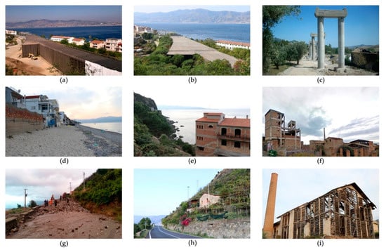 (a,b) Variant of the Cannitello-Villa San Giovanni railway line, preparatory work for the start of construction of the Bridge over the Strait, never built; (c) modernisation works of Bovalino-Bagnara, a transversal artery connecting the Mediterranean Motorway to the SS 106, never completed; (d,e) abusive or abandoned building near the Tyrrhenian coast; (f) Aspromonte wood processing inactive plant of the XIX century. The buildings have industrial archaeology restrictions imposed by superintendence; (g,h) a collapsed terrace due to the abandonment of crops, then recovered and recultivated; (i) abandoned spinning mill of the XIX century.