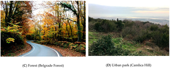 The third component of the survey included questions aimed at getting insights into where and why Istanbulites go to nature and which needs they expect to be fulfilled when they get to the nature area. Respondents were first asked which activity they preferred among the following; “spending time at the coast”, “walking in the forest”, “walking in the city park”, “doing sports at a sports facility”, or “other”. Then, to find out the degree to which the respondents would like to spend their time in a specific nature type, they were asked to rate each area using the Likert scale: “I would want a lot”, “I would want” “I would want a little”, and “I would not want”. They were provided with four photos, taken during the daytime in the first days of November 2018, representing the main natural area types in Istanbul; nature area on the seaside (Figure 2A); nature area near a lake (Figure 2B), forest area (Figure 2C), and an urban park (Figure 2D).
