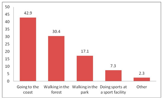 When respondents were asked which activity they preferred, in general, among four types of activities (depicted in Figure 3), 90% reported that they did an activity in the natural environment or an open space. The most preferred activity was spending time at the coast, with 42.9%, followed by walking in the forest then by walking in a city park.