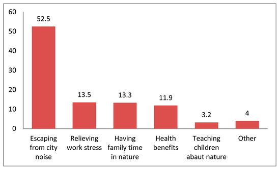 The last question was “What do you like most about being in nature?” The response categories included “escaping from the city noise”, “recovering from work stress”, “spending time with family”, “teaching children about the natural environment”, “benefit of it on healthy life”, and “other”. Respondents were allowed to give more than one answer for both questions.
