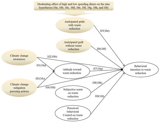 Food production, consumption, and waste are some of the greatest sources of anthropogenic GHG emissions [36,37,39]. Reducing food waste can therefore be a significant contribution to climate change mitigation, particular from foodservices, such as the restaurant sector, as more people eat out than ever before [1,10,12,36,37,45]. However, research on restaurant consumers’ waste reduction attitudes and behaviors is relatively limited in the foodservice industry, which has tended to focus on technical means to reduce waste for mitigating climate change [5,38,46]. In responding to this knowledge gap, this study has sought to better understand through the application of the TPB model what makes diners reduce waste for the purpose of addressing climate change while eating out at restaurants. Thus, this work sought to verify an extended TPB framework incorporating climate change awareness and mitigation pursuing actions, anticipated pride related emotions, four main TPB constructs, and dining expenses as a moderator.