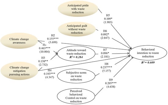 Results by PLS-SEM that appraised the research model are presented in Figure 2 [67]. The target variable for behavioral intention (60.9%) has been highly predicted by the R-square (R2) in the extended TPB than behavioral intention (52.6%) in the TPB. The evidence implies that the research framework in this study is superior to the TPB in accounting for consumers’ waste reduction intention while eating out. Path coefficients as well as t-statistics have been assessed for nine hypotheses by a PLS bootstrapping approach of 5000 re-samplings as recommended by Hair et al. [66] and Stevens [74]. Results show that climate change awareness has significant effects on attitude toward (γ = 0.463, t-value = 10.004) and behavioral intention to waste reduction (β = 0.155, t-value = 3.699). Additionally, climate change mitigation pursuing actions have significant effects on attitude toward (γ = 0.138, t-value = 2.732) and behavioral intention to waste reduction (β = 0.193, t-value = 4.347). In addition, behavioral intention to waste reduction is positively influenced by anticipated pride (γ = 0.109, t-value = 1.983) and anticipated guilt with waste reduction (γ = 0.092, t-value = 2.047). Furthermore, behavioral intention has been positively affected by attitude toward (γ = 0.096, t-value = 2.181), subjective norm on (γ = 0.237, t-value = 5.157), and perceived behavioral control on waste reduction (γ = 0.205, t-value = 4.638). Hence, all the nine hypotheses are supported, revealing that there is no rejected hypothesis.