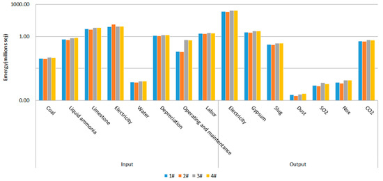 As shown in Figure 3, electricity, limestone, and liquid ammonia are consumed the most in the total input emergy. Although the main raw material of coal-fired power generation is coal, the emergy consumption of coal is less than the total emergy input of the above three materials. This is mainly due to China’s coal-fired power plants being currently installed or later rebuilt with environmental protection equipment to meet the requirements of the environmental regulation department. Therefore, in addition to the main raw material (coal), the plants also consume a large amount of resources for environmental management. The environmental protection equipment of the CD Power Plant mainly includes electric dust removal equipment, desulfurization equipment and denitration equipment. The CD Power Plant also adopts wet electrostatic precipitation (WESP) technology, selective catalytic reduction (SCR) technology, and limestone-gypsum desulfurization (FGD) technology to treat major coal-fired pollutants such as soot, NOx, and SO2.
