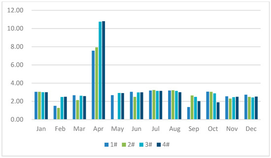 When the coal-fired power unit meets the above three constraints, it is eligible to participate in the evaluation of production cleanliness. We used EEVA values to measure the environmental added value of coal-fired power units. The EEVA value is also an emergy value, which is the embodiment of the environmental effects of production. Figure 4 and Table 8 show the unit EEVA values and comparisons for the four coal-fired power units. Through the above analysis, we identified months where the four units do not meet the constraints of the clean scheduling model. Therefore, from the perspective of clean dispatch, the units that do not meet the conditions are excluded from the monthly dispatching schedule, and the monthly cleanliness rankings of the four units are shown in Table 9.