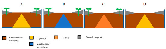 Design of the combined mushroom and cucumber experiment, showing how materials were arranged in the containers (cross section). Mycelium means here mushroom compost (not SMC). (A) Plants + mushroom compost; (B) Plants + pasteurised mushroom compost; (C) Plants + perlite; D: No Plants + mushroom compost. Volumes are given in Table 1.