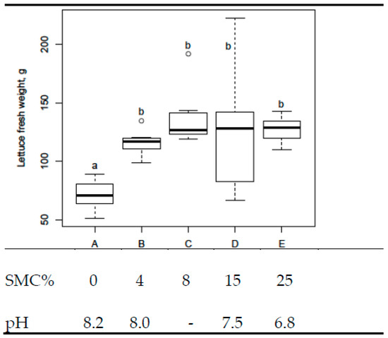 Fresh weight yield, proportion of SMC (by volume) added to the compost mix, and pH at sowing in Lettuce experiment 1. Different lower case letters indicate significant differences between treatments according to a Tukey HSD test (p < 0.05). Spent mushroom compost (SMC) is A. subrufescens. Digestate fertigation used (EC = 1.5 mS cm−1). Details on the treatments are given in Table 1.