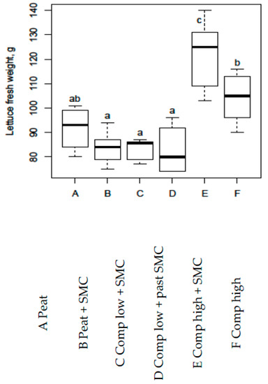 The chemical properties of the mixed substrates are presented in Table 3. The average fresh weight of the non-fertigated and fertigated lettuce heads was 119 g and 202 g, respectively (this difference was significant, p < 0.01). Among the fertigated, there were no significant differences between the treatments. In the non-fertigated treatments, the yield was more than doubled when 20% of the commercial peat substrate was substituted with SMC (compare treatments A and B, Figure 4, where only the non-fertigated are included). There were no other significant differences. The dry weight yield data led to the same conclusions and are therefore not presented.