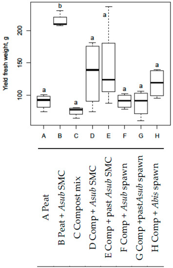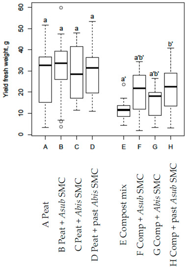 Fresh weight yield in Lettuce experiment 3. Different lower case letters indicate significant differences between treatments according to a Tukey HSD test (p < 0.05). SMC is A. subrufescens. No fertigation used. Details on the treatments are given in Table 1.