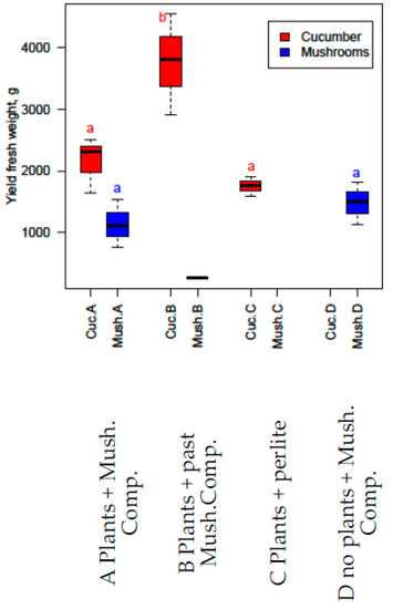 Mushrooms and plants were grown together in the same container (Figure 7). However, there was a significantly higher cucumber yield when the mycelium was inactivated by pasteurisation (B) than in the live mycelium (A) and perlite (C) treatments. Mushrooms fruited in one crate despite pasteurisation (B).
