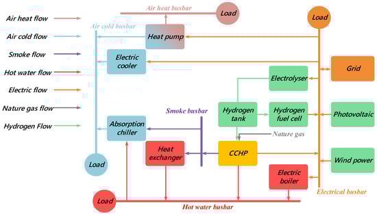The HPES generally contains five energy-carrier busbars including the electrical busbar, hot water busbar, smoke busbar, hot air busbar, cold air busbar. The energy balance of each busbar is expressed by Equations (1)–(5):