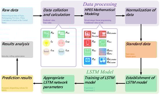 The procedure of the data-driven approach for HPES scheduling is shown in Figure 2. The characteristics of the LSTM model (i.e., the predicted value of the PV power, wind power, and load) are obtained through the integration and calculation of the raw data, which forms the input space of the model. After the optimization computation, the label of the LSTM model (i.e., the day-ahead economic scheduling scheme of the integrated energy system) can be derived, which establishes the output space of the model. The input and output space are normalized so that they can be used as the standard data for the LSTM model. Appropriate LSTM network parameters are obtained by training the LSTM model. Consequently, the day-ahead economic scheduling scheme of the HPES can be achieved from the predicted values of the PV power, wind power, and load. In order to verify the performance of the optimized scheduling scheme generated by the LSTM, this paper establishes the intra-day rolling optimization model of the HPES and compares the intra-day rolling results of three different day-ahead economic scheduling schemes based on LSTM, mixed integer linear programming (MILP) and conditional value at risk (CVaR), respectively.