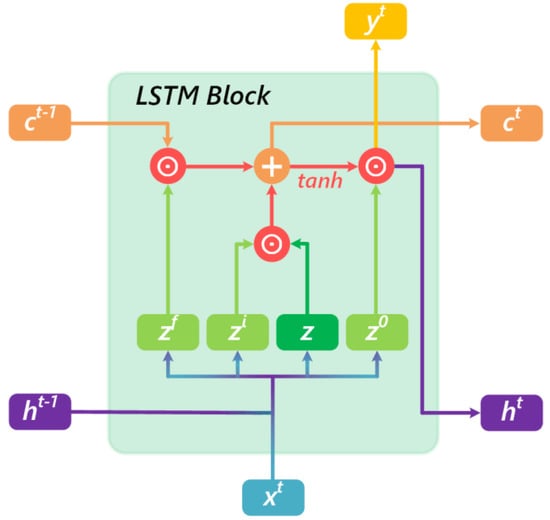 The internal architecture of an LSTM unit is indicated in Figure 4 where four training states are achieved via combining the current input and the that is outputted from the previous time t − 1. , and represents the results of the forget gate, input gate and output gate which are derived by applying the sigmoid function to the product of the weight (e.g., , or ) and the concatenated vector [, ]. The results are between 0 and 1. z is the network input which is converted to a value between −1 and 1 by applying the tanh function to the product of the weight and the concatenated vector [, ].