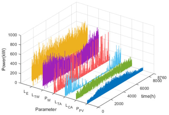 Using Equations (36) and (37), the actual output of the wind turbine and PV panel can be calculated. Since this study focuses on the day-ahead economic scheduling, the input to the model should be the predicted values. On top of the actual values achieved from Equations (36) and (37), a disturbance that is a function of time t (1.5t/100) is added to construct the input data for the model. Figure 5 shows the input data for the LSTM training set.