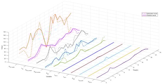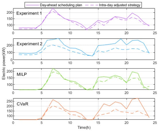The CCHP operation plan obtained from Experiment 1, Experiment 2, MILP, and CVaR methods is compared to that from the optimal intra-day scheduling scheme as presented in Figure 11. In the first 1–8 h, the predicted values are relatively accurate and thus the optimization strategies provided by MILP and CVaR are closer to the optimal intra-day scheduling scheme. When the error of the predicted values grows, the gaps between the MILP and CVaR strategies and the optimal strategy are more obvious. By contrast, the optimization strategy derived from Experiment 1 maintains close to the optimal scheme in the later period, outperforming the other three strategies. This can also be verified by the associated system operation cost where Experiment 1 sees the lowest cost of ¥5493. The system operation cost of Experiment 2, MILP and CVaR are ¥5504.3, ¥5653.6 and ¥5548.4, respectively.