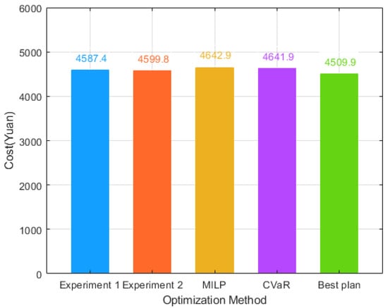 Based on the results of intra-day rolling optimization, the intra-day operating cost of the integrated energy system can be calculated using Equations (23)–(25). In this paper, 41 days’ data within the test set are used in Experiment 1, Experiment 2, MILP optimization and CVaR optimization to determine the day-ahead scheduling schemes. After the intra-day rolling optimization, the corresponding intra-day operating cost is derived. Figure 9 presents the average intra-day operating cost in 41 days for each optimization approach and the best plan. By applying the MILP optimization to the actual data, the optimal intra-day scheduling scheme is achieved. The MILP based method results in the highest average operating cost of ¥4642.9, which is ¥1 higher than that obtained from the CVaR based method. Experiment 1 leads to the lowest average operating cost of ¥4587.4 which is lower than that of MILP by 1.17%. The average cost obtained in Experiment 2 is ¥4599.8 which is lower than that of MILP by 0.93%. The final result of Experiment 1 is closest to the optimal solution. It can be observed that the average intra-day operating costs of Experiment 1 and Experiment 2 are lower than those of MILP and CVaR methods, which proves the feasibility of using LSTM model for day-ahead economic scheduling and the economic performance is better than MILP and CVaR.
