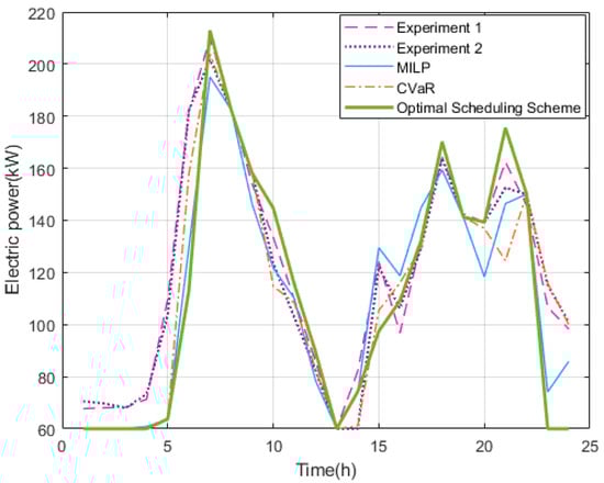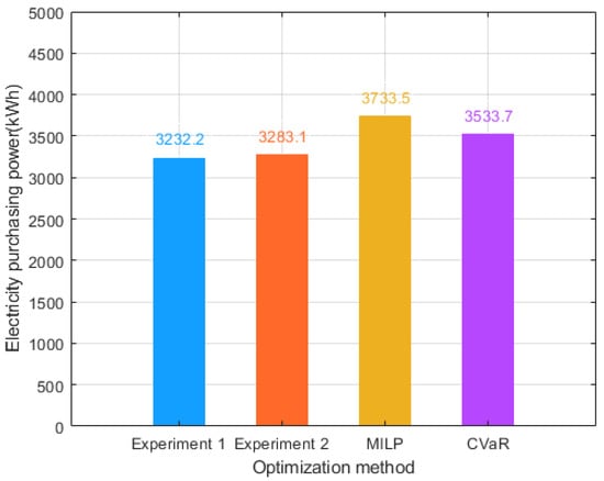 This section compares the amount of electricity that is required to be purchased when using different intra-day rolling scheduling schemes and Figure 12 shows the results on 29th June. The amount of the purchased electricity in Experiment 1 is 3232.2 kWh which is the smallest among all four optimization schemes. It is lower than that of Experiment 2, MILP and CVaR by 1.6%, 13.4%, and 8.5%, respectively. Purchasing less mount of electricity can reduce the grid pressure and Experiment is superior to other methods from this perspective.