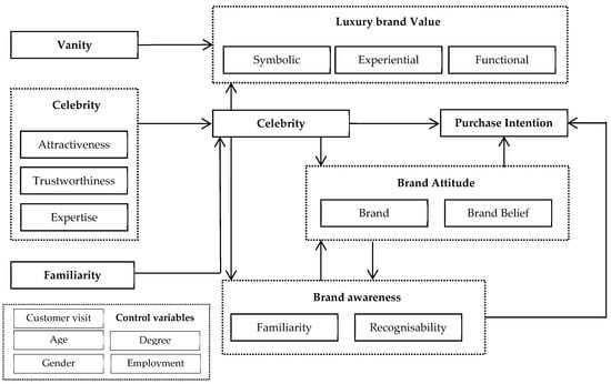 The importance of celebrity endorsements has made several researchers examine its effectiveness [22]. It is suggested that celebrity endorsers cut off the clutter in conveying the brand message to the consumers. They enhance product desirability and product glamour [15]. They are an effective strategy for gaining attention [23], improving marketing effectiveness [24], creating positive emotions towards the product/brand [25], impacting brand attitude, influencing on brand recall/recognition [26], enhancing purchases [27], impacting on loyalty [28], and improving product sales [29]. Recent research shows that celebrity credibility enhances brand image [30], brand credibility [31], brand equity [32], corporate credibility, and corporate image [33]. Despite these studies, current research shows that very little research work has been done on celebrity credibility [34], luxury brand value, brand awareness, and familiarity, and further their effects on attitudinal and behavioural constructs. To minimise these gaps, a conceptual model based on these relationships is developed. To address these relationships, associative network theory and theory of planned behaviour are used. Then, by verifying the conceptual model, the purpose of the study is to examine the importance of celebrity credibility, luxury brand value, brand awareness, and familiarity on attitudinal and behavioural constructs of the consumers in order to use celebrity endorsers to enhance sustainable product allure and glamour also in the luxury sector, considering that the domain of luxury is disconnected from daily purchases. Results from this study would help managers and advertisers to understand these effects in detail.