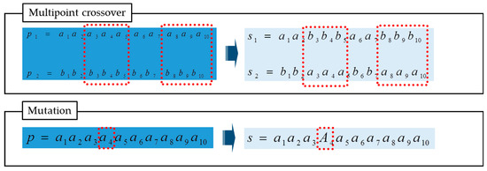 Figure 2 shows the simple example of crossover and mutation in a GA. In the last step, the GA provides a set of solutions to a given problem. Moving on to the next generation, the evolutionary rules are implemented based on the fitness scores of chromosomes; these scores measure how well chromosomes fit the problem. Typically, chromosomes that have higher fitness scores have a higher probability of being chromosomes for crossover according to a selection rule. A crossover rule is a way to create better chromosomes by mixing two different chromosomes, and a mutation rule randomly selects and changes the genes of chromosomes. By repeating this process, chromosomes gradually fit the objective function through selection, crossover, and mutation and are closer to the optimal solution.