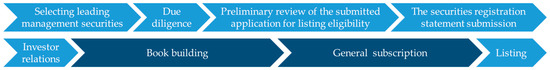 Figure 3. If a company that meets certain requirements, such as the period and size of operation, wishes to be listed, it selects leading management securities at least two months before it applies for a preliminary review of listing eligibility. The selected leading manager shall conduct due diligence on the client and perform a preliminary review of the listing eligibility of the company. Then, the company will submit the securities registration statement for evaluation of the adequacy of the public offering, and the investor relations of the company will provide investors with an accurate account of the company’s affairs. Afterwards, the IPO will set the public offering price through a process called book building, which is carried out by institutional investors. In this step, some companies withdraw their listing if the determined public offering price is not satisfactory. When the IPO price is determined, individual investors are allowed to invest in IPO stocks through a general subscription. Once book building is complete, numerous variables, such as the book building competition rate or the percentage of the lock-up ratio that is guaranteed protection against selling shares for a certain period, are determined. Some days later, the listing proceeds.