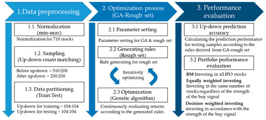 1]. This classical model requires historical market price and volatility data of each stock included in a portfolio to estimate the inputs of the model. Due to lack of historical market data of IPO stocks, this traditional model cannot be used for IPO stock portfolio allocation. Thus, using nonfinancial data disclosed in the IPO process, we employ machine learning portfolio allocation that does not require estimating input parameters from market data. In this study, we employ the rough set theory based on a GA. We use the rough set theory which is particularly useful for ambiguous and incomplete data because it is appropriate for ambiguous big data generated during the IPO process. To create an optimal rule set based on the rough set theory, we employ a GA which is widely used for optimization methodology to optimize the variable selection and to find optimal values of the selected variables. To the best of our knowledge, this is the first study that uses rough set theory and a GA for IPO stock portfolio allocation.