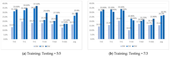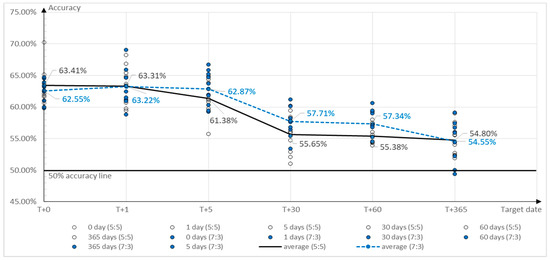 Table 8 shows the prediction accuracy resulting from the repeated tests. We conduct the tests 10 times for each target day using the ratios of the training set to the testing set of 5:5 and 7:3, leading to a total of 120 tests.