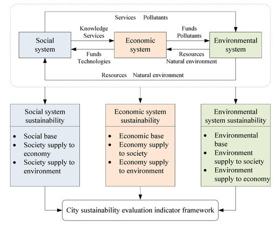 Due to the interaction of the social, economic and environmental systems of the city, the sustainability of the three systems should be considered when measuring the city sustainability. It can be seen from Figure 1 that the dotted frame contains three interacting systems, namely social system, economic system and environmental system. The corresponding interactions are as follows. The economic system provides corresponding funds and technologies for the sustainability of the social system, while the social system provides the necessary knowledge and services for the economic system. In order to achieve the sustainability of the economic system, it is necessary to obtain the corresponding resources and natural environment from the environmental system. However, the pollutants produced by the economic system have an adverse impact on the environmental system. Therefore, it is necessary to invest the funds into the environmental system to improve its state. The environmental system provides the resources and natural environment for the social system. At the same time, the environmental services provided by the social system promote the sustainability of the environmental system, but the pollutants produced by the social system enter the environmental system.