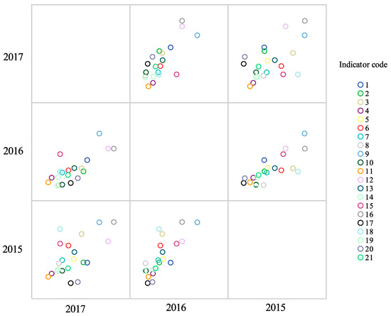 The relationship between indicators’ weights of different years is shown in Figure 2. There is a slight change in the position of the same color point in the figure, but the overall change is not large. The colored point represents the X and Y axes of an indicator in different years. Furthermore, we use the weights of each year as a sample to calculate the correlation coefficient between the weights in different years. The correlation coefficients of indicator weights for 2015 and 2016, 2016 and 2017, 2015 and 2017 are 0.7860, 0.7676 and 0.5797, respectively. It can be found that the correlation coefficients of the adjacent years are larger (the scatter plots for 2015 and 2016, 2016 and 2017 are more concentrated as shown in Figure 2), and the correlation coefficient between the years with longer intervals is smaller (the weighted scatter plots for 2015 and 2017 are more discrete in Figure 2). This is consistent with the idea of government behavior guiding policy making in reality; that is, the focus of work will gradually change over time, but the overall level must maintain a certain degree of correlation, and the longer the interval, the less relevant.