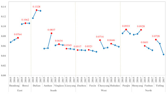We obtained the sustainability performances of the 14 prefecture-level cities in Liaoning Province (2015–2017) by using , where and have been calculated above, as shown in Table 4. The average evaluation value was obtained by ; The growth rate was calculated by . Further, Figure 3 shows the change in the sustainability values of the cities in different years.