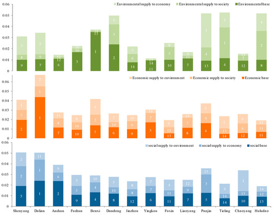 The sustainability evaluation results showed that the cities in eastern Liaoning (0.0888) had the highest sustainability level, while those in western Liaoning (0.0624) had the lowest level. The sustainable level of southern Liaoning (0.0771) is better than that of northern Liaoning (0.0674). The performances of the 14 cities in Liaoning were not perfect. Both the evaluation values and growth rates of 7 cities (accounting for 50.00%) were lower than the overall average level. In terms of the three dimensions, the systems’ evaluation values of the 14 cities were not balanced. The evaluation values of the social, economic and environmental systems fluctuated within the range of [0.0159, 0.0346], [0.0151, 0.0677] and [0.0123, 0.0483], respectively. There were 10 cities (accounting for 71.43%) with the maximum and minimum ranking differences greater than or equal to 5. From the perspective of sub-dimension, the social system of most cities supplied more for the environmental system (accounting for 64.29%) than for the economic system (accounting for 35.71%). Similarly, the economic system of most cities supplied more for the environmental system (accounting for 57.12%) than for the social system (accounting for 42.86%). Cities with higher environmental base rankings, such as Benxi, Dandong and Fushun, offered less supply to other systems.