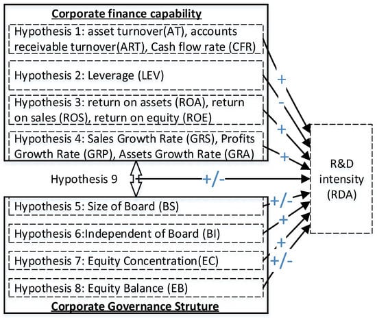 Based on the above analyses, corporate governance structure affects R&D investment. Meanwhile, the corporate governance structure also affects corporate finance. For example, the concentration of equity has an inverted U-shaped relationship with ROE [61]. Moreover, financial constraints would disappear in well-governed firms [62]. Vo and Le (2017) [17] considered that the effects of corporate governance structure on R&D investment are driven by certain financial indicators, such as profitability and cash flow. This leads to the following hypotheses for the second research question: