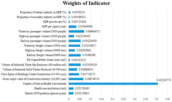 The weights of the indicators are generally very similar, with most values being between 0.004568 and 0.405219. The weight for the number of beds in health care institutions is the highest of the indicators, and this indicator is positive, representing a positive aspect of the social subsystem. Waterway passenger traffic and gross output value of the construction industry have the next highest weightings; the former is a reverse indicator belonging to the transportation subsystem, and the latter is a positive indicator belonging to the social subsystem. These results illustrate the significant role of the social and transportation subsystems in the evaluation system.
