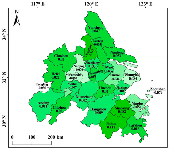 Using the improved entropy method from the perspectives of supply and demand, the comprehensive carrying capacity values of the 26 cities were calculated (see Table 2). In Figure 2, depth of color is used to represent the magnitude of values. The UCC values for 2018, ranked from high to low, are as follows: Yangzhou (0.111), Jinhua (0.111), Shaoxing (0.082), Nantong (0.053), Yancheng (0.047), Taizhou (0.035), Zhenjiang (0.033), Hefei (0.022), Huzhou (0.020), Chuzhou (0.020), Chizhou (0.020), Changzhou (0.018), Tai’zhou (0.016), Anqing (0.011), Jiaxing (0.009), Wuxi (0.006), Xuancheng (0.002), Wuhu (−0.007), Hangzhou (−0.009), Tongling (−0.035), Suzhou (−0.044), Ningbo (−0.051), Ma’anshan (−0.067), Nanjing (−0.076), Zhoushan (−0.079), Shanghai (−0.084).