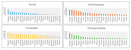 The carrying capacity values for the four subsystems, that is, the social subsystem, economic subsystem, environmental subsystem, and transportation subsystem, for each city in 2018 are presented in Figure 3. As can be seen, the values of the social and transportation subsystems are generally higher than those of the other two subsystems, and this finding is consistent with the results in Section 4.1; that is, the weights of the social and transportation subsystems are comparatively high and, therefore, these subsystems play the most important roles in the evaluation system, followed by the economic and environmental subsystems, respectively. Shanghai performed the best in social subsystem measures, due to the excellent provision of education and medical resources; Jinhua, Ningbo, Yangzhou, Nantong, and Shaoxing also had high scores in this category. Shanghai also ranks first in its transportation subsystem, followed by Ningbo, Zhoushan, and Hangzhou, all of which have excellent harbors as well as huge logistics and transportation capacities. In accordance with expectations, Shanghai performs the best in economic measures, although other cities in the Delta are very close to Shanghai in this respect because economic development conditions are quite evenly distributed in the area. In terms of environmental measures, Nanjing, Suzhou, and Shanghai are the best-performing cities.