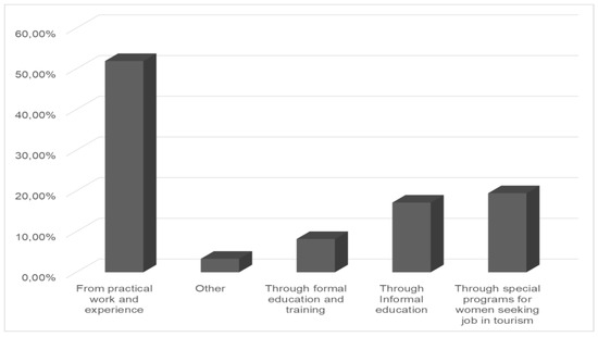 The interview and survey questions were: “Do you have formal education in tourism?”, “Would you like to establish a business in tourism, and what type of business do you prefer?”, “What factors can influence your decision to start up a business in tourism?”, “What obstacles are women faced with when starting a business in tourism?”, and “What are the opportunities for strengthening the position of women in tourism?” (