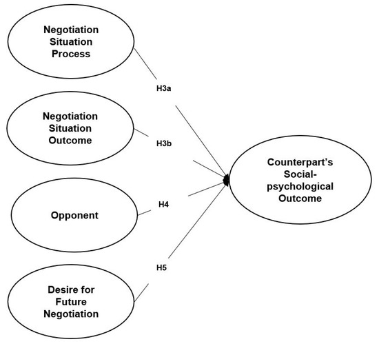 The goal of negotiations is to achieve an outcome that contents both parties. Negotiation results could be measured by two types: integrative settlement (refer to Figure 1) to create an agreement benefical for both parties [38]; and a counterpart’s social psychological outcomes (refer to Figure 2), the subjective social perceptions held by negotiating parties following the encounter [22,39].