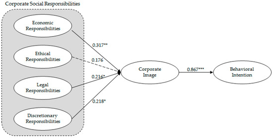 We tested the hypothesis 1, the economic responsibility fulfillment left meaningful impact on the corporate image (H1, β = 0.317, CR = 3.134, p < 0.01) statistically. Thus, hypothesis 1 has been supported. We tested the hypothesis 2, the ethical responsibility of the company has not found to be meaningful on the corporate image (H2, β = 0.176, CR = 1.737, p > 0.05) in terms of statistics. For that reason, hypothesis 2 has not been supported. We tested the hypothesis 3, the legal responsibility fulfillment has found to be meaningful on corporate image (H3, β = 0.216, CR = 1.974, p < 0.05) statistically. For that reason, hypothesis 3 has been supported. When we tested hypothesis 4, the discretionary responsibility fulfillment was found to have a meaningful impact statistically in terms of the corporate image (H4, β = 0.218, CR = 2.362, p < 0.05). For that reason, hypothesis 4 was supported. After we tested the hypothesis 5, it was found that the impact of corporate image on the behavioral intention (H5, β = 0.867, CR = 12.936, p < 0.001) was meaningful statistically. For that reason, hypothesis 5 was supported. The impact of the social responsibility on corporate image was large in the order of economic (β = 0.317), charitable (β = 0.218), and legal (β = 0.216) responsibilities.