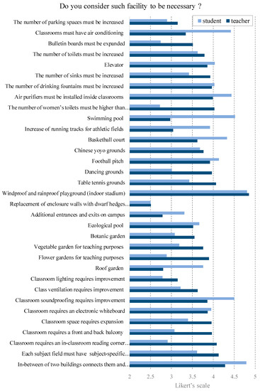 The number of women’s toilets and men’s toilets has consistently been one of the major issues of discussion for public architectural design. Women spend a longer time using a toilet compared with men, and thus providing a greater number of women’s toilets is reasonable. The item ‘the number of women’s toilets must be higher than that of men’s toilets’ was rated by teachers as the most needed item. However, this might not considerably affect elementary school students, as evident by their rating it as the least important item. ‘Installing air purifiers’ has become a new trend in Taiwan in recent years. This is particularly true during fall and winter when air pollution is more serious and numerous schools usually cancel originally scheduled outdoor sports competitions. Air purifier installation has become one of the public sector’s main subsidy projects for schools. ‘Installing air conditioners inside classrooms’ has also become a topic of discussion in recent years. Teachers consider air-conditioning to be unhealthy, whereas students consider it to be comfortable; thus, a considerable difference in rating existed.