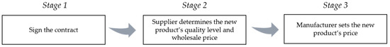 The decision-making timeline, illustrated in Figure 1, includes three stages. First, the manufacturer and supplier sign the contract. There are two different contracts: (i) a revenue-sharing contract, in which the manufacturer first proposes to share an portion of its revenue with the supplier, and (ii) a cost-sharing contract, in which the manufacturer offers the supplier to share a portion of the development cost. Second, the supplier then determines the quality level of the new product and the wholesale price . Finally, the manufacturer decides on the new product price , and the revenues of the new product development project are realized.