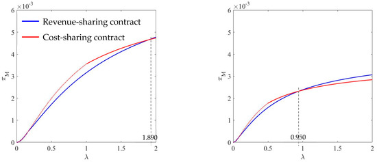 Here, we compare the results of the revenue- and cost-sharing contracts under the cooperative relationship. According to the findings in the previous sections, the revenue- and cost-sharing contracts are not feasible when and , respectively. In other words, when is within range , both contracts are equivalent to the wholesale price contract; when is within the range , the cost-sharing contract is equivalent to the wholesale price contract; and when , both contracts are feasible. For consistency, we maintain the names of the revenue- and cost-sharing contracts, regardless of the feasible ranges.