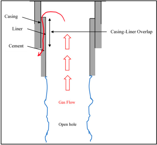 Schematic of gas migration through the liner hanger and cement within the casing–liner overlap.
