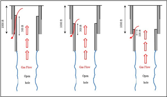 Four leakage scenarios were developed to simulate gas leakage through the cement placed within the casing–liner overlap. The difference between these scenarios is the differential pressure exerted across the cement behind the casing–liner overlap. The differential pressure was varied from 250 to 1500 psi. In each scenario, four permeability values were used to assess the risk associated with each value. In addition, the casing–liner overlap was varied to investigate how the overlap length is going to help ensure good well integrity. The objective of developing these scenarios was to investigate the optimum length of the casing–liner overlap. Figure 2 shows gas leakage through different lengths of the casing–liner overlap. Select assumptions applied to the leakage scenarios are as follows: