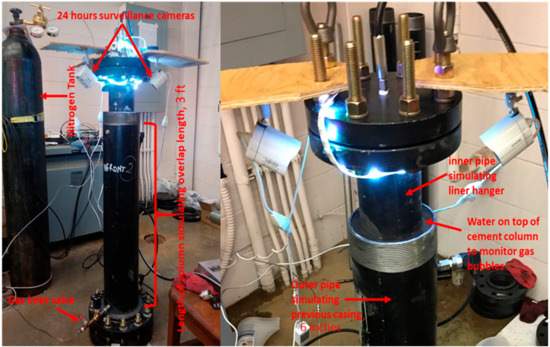 The experiment comprised of three cycles, and each cycle had three tests. The term “cycle” is used to describe two to three consecutive tests, while the term “test” is used to describe the flow of N2 in the artificial annulus. Once the cement slurry was mixed according to the API procedure, it was then poured into the artificial annulus. Then, prior to the proposed WOC time, the video cameras and pressure transmitters were connected. Finally, N2 was injected at a stabilized pressure of 60 psig to assess the sealability of the cement sheath. During the injection period, the surface of the cement sheath was monitored to detect any gas bubbles coming out. The time, where the first gas bubble was detected, was noted and considered as the leakage time. The leakage time can be defined as the time it takes for the nitrogen gas to travel from the bottom of the setup through the cement and reach the top of the cement. In other words, the time it takes for the first bubble to appear at the top of the cement bearing in mind the time at which the nitrogen gas was injected.