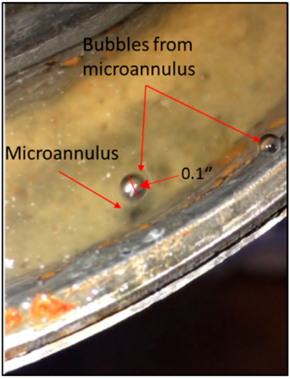 Neat Class H cement was used to prepare the cement slurry used in the experiment. This slurry had a 38% water/cement (W/C) ratio. The first test in the first cycle was conducted after 24 h of WOC time. The first bubble of gas was detected after 11 min after the commencement of the test. The leakage time of the second test in the first cycle, when the cement age was 2 days, decreased to 5 min. However, in the second cycle of the first test, where the cement age was 11 days, the first bubble was recorded 11 min after the beginning of the test, and then declined afterwards in the second and third tests within the second cycle. This behavior was observed in the third cycle, too. The increase of leakage time between the last test in a cycle and the first test in the succeeding cycle can be associated to the fallow period between the conducted cycles. This increase of leakage time can also be ascribed to the vanishing of some bubbling positions. The disappearance of the bubbling position is also known by the self-healing phenomenon, and it has been documented and discussed in the literature [47,48,49]. The authors believed that this phenomenon occurs due to the mobilization and precipitation of minerals along the pathways within the cement sheath. Figure 4 shows a microannulus bubbling from the cement sheath. The bubbles observed on the annulus surface were not intense.