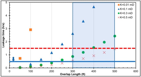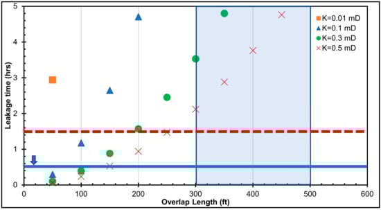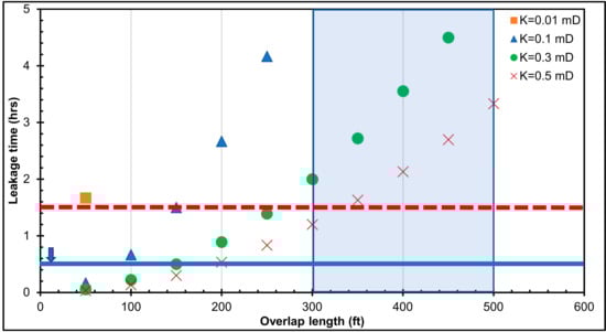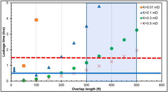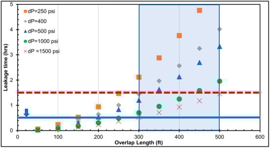 Leakage time versus casing–liner overlap length for a 500-psi pressure differential across the cement.