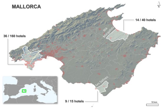 Three representative tourist municipalities of the island were selected for this study: Calvià, Ses Salines, and Santa Margalida, in south-western, south-eastern, and north-eastern Mallorca, respectively (see Figure 1). All three municipalities are coastal regions and their hotel plants, representative of the sun-and-sand market segment, offer a total of 64,450 beds, which is 27.2% of the total hotel availability in Mallorca.