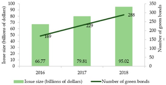 Since the formal launch of China’s green bond market at the end of 2015, both the quantity and value of green bonds have increased. From 2016 to 2018, the number of green bonds issued shows a linear growth trend, as shown in Figure 1.