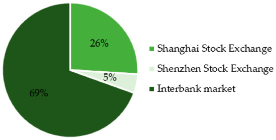 In terms of the issuance location, more than two-thirds of green bonds are issued in interbank markets, and the remaining part of green bonds is issued on the Shanghai or Shenzhen Stock Exchange. The number of green bonds issued by the Shenzhen Stock Exchange is far smaller than that issued by the Shanghai Stock Exchange, as shown in Figure 3.