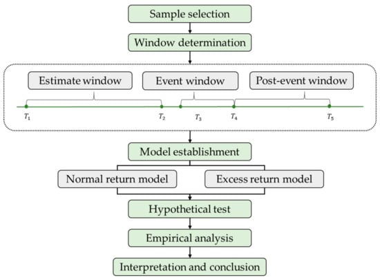 The main steps in the event study approach are as follows. First, the research object should be specified, that is, the specific event should be identified. Second, samples should be selected based on availability, representativeness, and accuracy to ensure that accurate conclusions with broad significance can be drawn. Third, the estimation window, event window, and post-event window should be specified. The estimation window refers to the specific time frame used to calculate normal returns, i.e., the expected returns that would have occurred within the event window in the absence of the specified event. The selection of the event window is related to the research object (i.e., the degree of influence of an event), and should be specified in accordance with the specific situation. The post-event window enables the long-term impact of an event to be analyzed. The framework of the event study approach is shown in Figure 6.