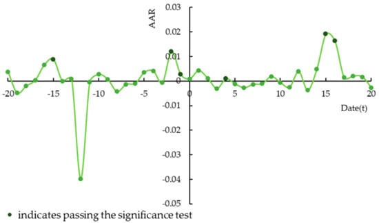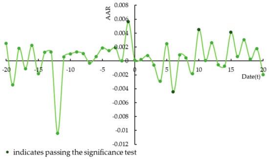 The results shown in Table A1 and Figure 7 reveal the daily AARs and significance in the [−20, 20] window (41 days). The AARs are negative on 18 days and positive on 23 days. There is no significant change in the situation regarding negative AARs before and after the occurrence of the event. However, before the event occurs, AARs are significantly positive at the 1% level when t = −1 and at the 10% level when t = −15 and t = −2. On the day of occurrence, AARs are positive but not significant. After the event occurs, AARs are significantly positive at the 5% level when t = 4 and at the 1% level when t = 15 and t = 16. After the event, AARs are significantly higher than before the event. This indicates that the stock market reacts positively to the issuance of green bonds by financial companies. The significantly positive values when t = −2 and t = −1 suggest that information may be disclosed in advance.