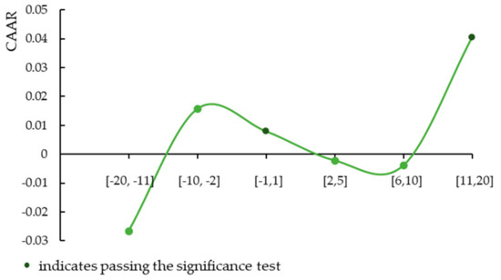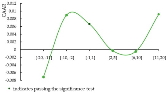 Table A3 and Figure 9 show the CAARs and significance of the 44 green financial bonds issued by financial companies within the 41-day time frame ([−20, 11], [−10, −2], [−1, 1], [2, 5], [6, 10], and [11, 20]). Table A4 and Figure 10 show the CAARs and significance of the 80 green bonds issued by non-financial companies within all the above time intervals. It can be seen from Figure 9 and Figure 10 that CAARs are not significantly positive or negative prior to the event, while the CAAR is significantly positive at the 10% level in the [−1, 1] event window, indicating that green bond issuance has a positive impact on the stock prices of issuing companies. Thus, H1 is supported. Similar to the findings of Haesen et al. [18] and Reboredo’s study [31], we have demonstrated a link between the stock market and the bond market in China. The announcement of issuing green bonds can convey the company’s intention to external stakeholders and thus achieve the purpose of attracting investors.